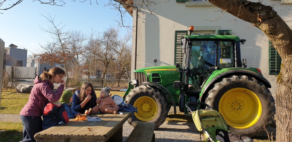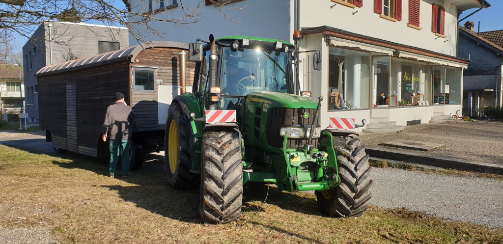 Am Donnerstag, 10.02.22, kam der alte Zirkuswagen mit dem riesigen Holzofen drinnen auf die Wiese zwischen dem Nachbarschaftshaus und dem Alten Konsum. Er ist eine Leihgabe von Mark und Eli Wilhelm.
