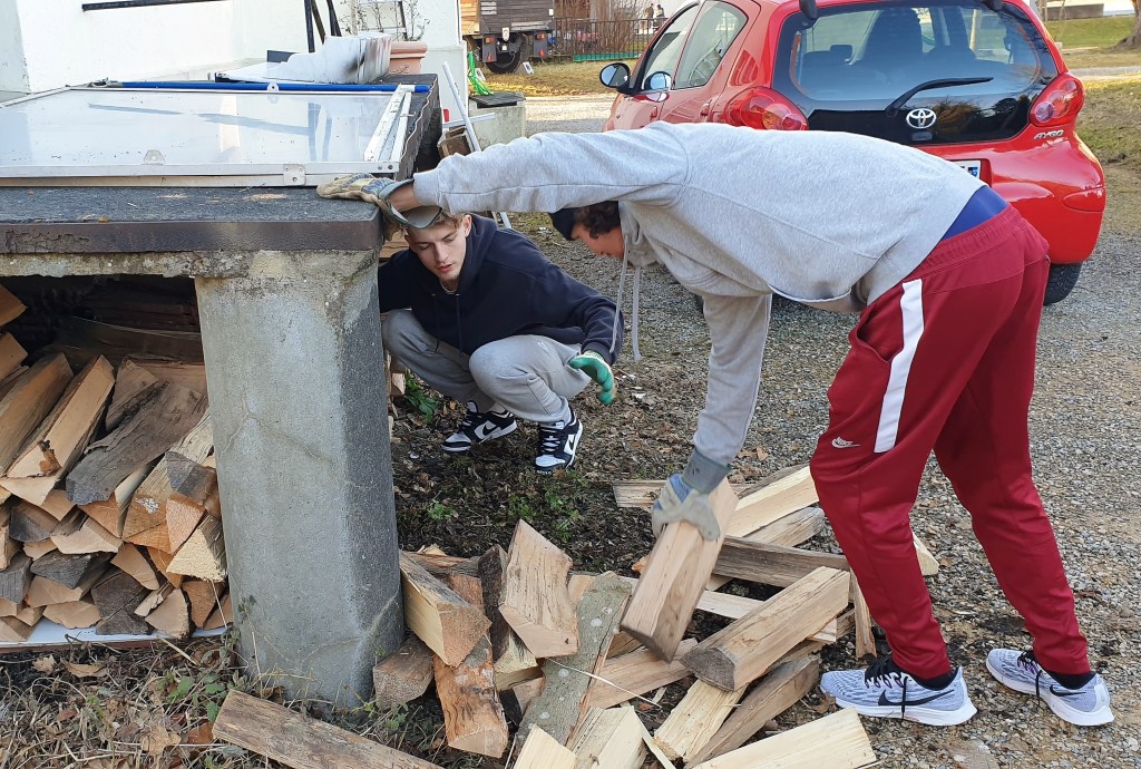 Am nächsten Tag lieferten sie das Holz zum Heizen. Jungs verschiedenen Alters schlichteten es hinter den Alten Konsum.