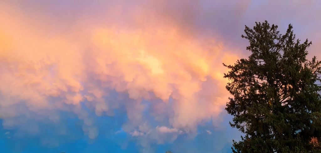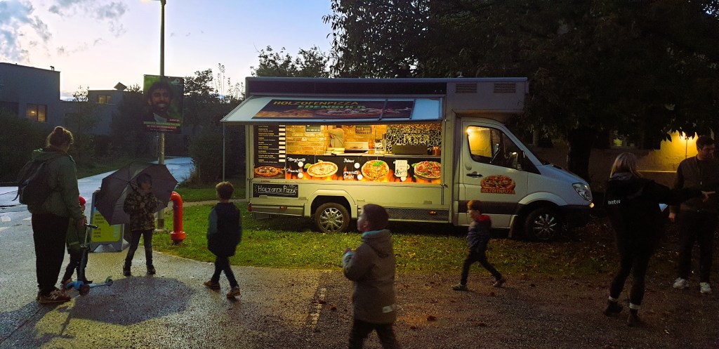 Es wird früher dunkel und der Himmel bietet, wie beim letzten Freitagabend-Apéro, grandiose Farbereignisse. Aman hat wunderbare Pizzen gebacken.