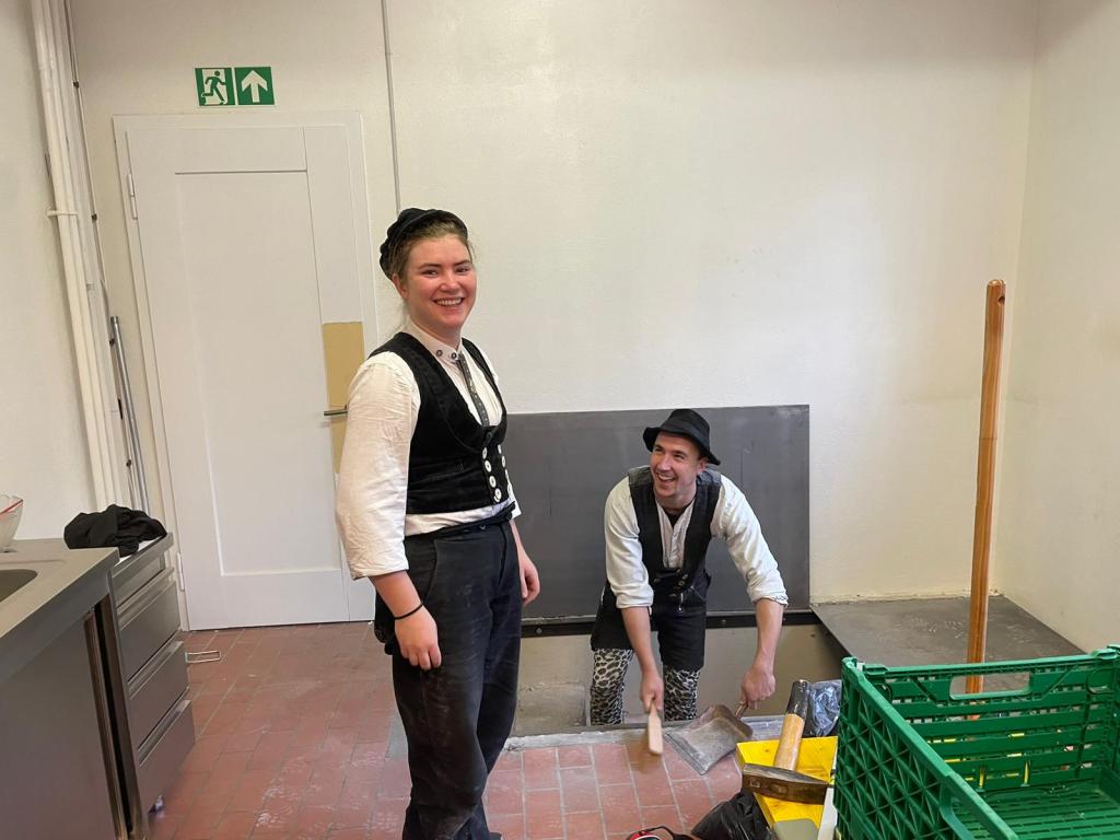 Marie und Helge, zwei Handwerker auf der Walz, stopften profimässig die Fugen zwischen Stahlplatte und Fussboden – dort muss zukünftig einmal der Herd sicher stehen! Danke!
