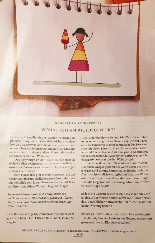fragen Krogerus und Tschäppeler im Tagesanzeiger Magazin vom 6.4.2024, um den ultimativen Wohnort herauszufinden. Die Glacetruhe im Alten Konsum wird von so vielen Kindern rege benutzt, dass wir annehmen müssen, etwas zum idealen Wohnort beizutragen 🙂