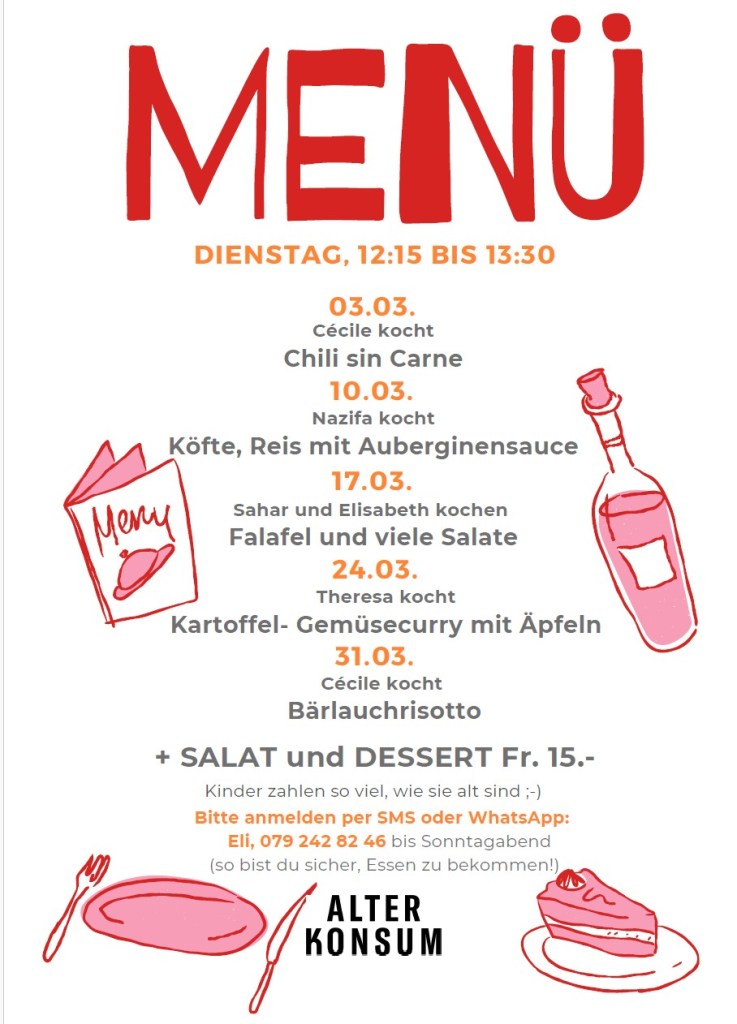 Veröffentlicht am 25. Februar 2026 von eli wilhelmDer März hat FÜNF Dienstage! Das heisst, wir können uns 5x im Alten Konsum bekochen lassen: Teilen mit: Auf Facebook teilen (Wird in neuem Fenster geöffnet) Facebook Gefällt mir Wird geladen … Ähnliche Beiträge