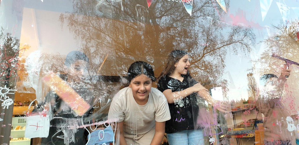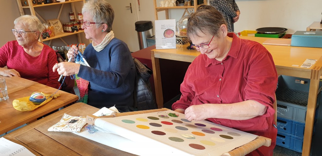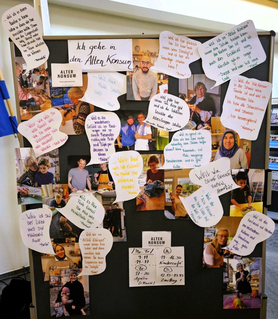 Der Alte Konsum war am 11.11.23 bei der Veranstaltung „verein(t)“ in der Bärenmatte, bei der sich alle Suhrer Vereine vorstellten. Wir hatten im Vorfeld Mitarbeiter und Gäste befragt, weshalb sie in den Alten Konsum gehen/ dort arbeiten. Ihre Fotos und Aussagen prangten an der Pinwand und wir knüpften spannende neue Kontakte. Das Konzert letzten Freitag mit iranischem Essen von Sahar und Kaveh und virtuoser Trommel-Musik von Marianne und Didine war unglaublich stimmig! Danke, liebe Musikerinnen und Köchinnen! Die Kinder haben das Halloween-Fenster geputzt zusammen mit Enita, unserm Putz-Engel, und ihrem Kärcher. Die Gespenster waren an der angelaufenen Scheibe beim Konzert immer noch geisterhaft zu sehen – toll! Und es war noch einmal sonnig zum draussen spielen. Zum ersten mal haben sich die Damen getroffen fürs Sticken. Jeweils am ersten Dienstag im Monat kann sich künftig ab 14 Uhr jedeR dazusetzen mit eigenem Material und bekommt Anregungen und Hilfe! Sie waren begeistert. „So gemütlich bei Euch! Keine Miete, supernette Menschen ringsum – wo gibt es denn das sonst noch?“ Tja – im Alten Konsum 😉