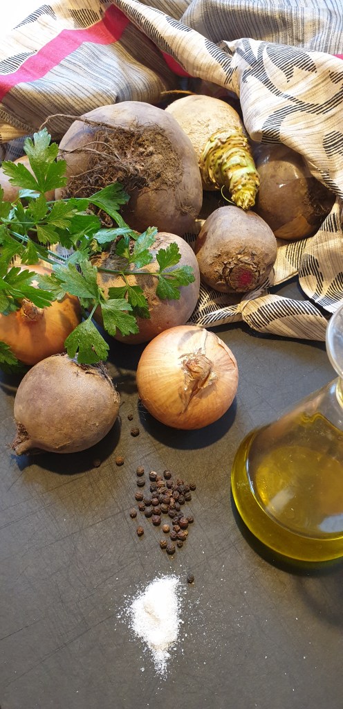Randensuppe mit Rindfleischbrühe (und vegetarisch), Focaccia, Salat, Mini-Dessert.
